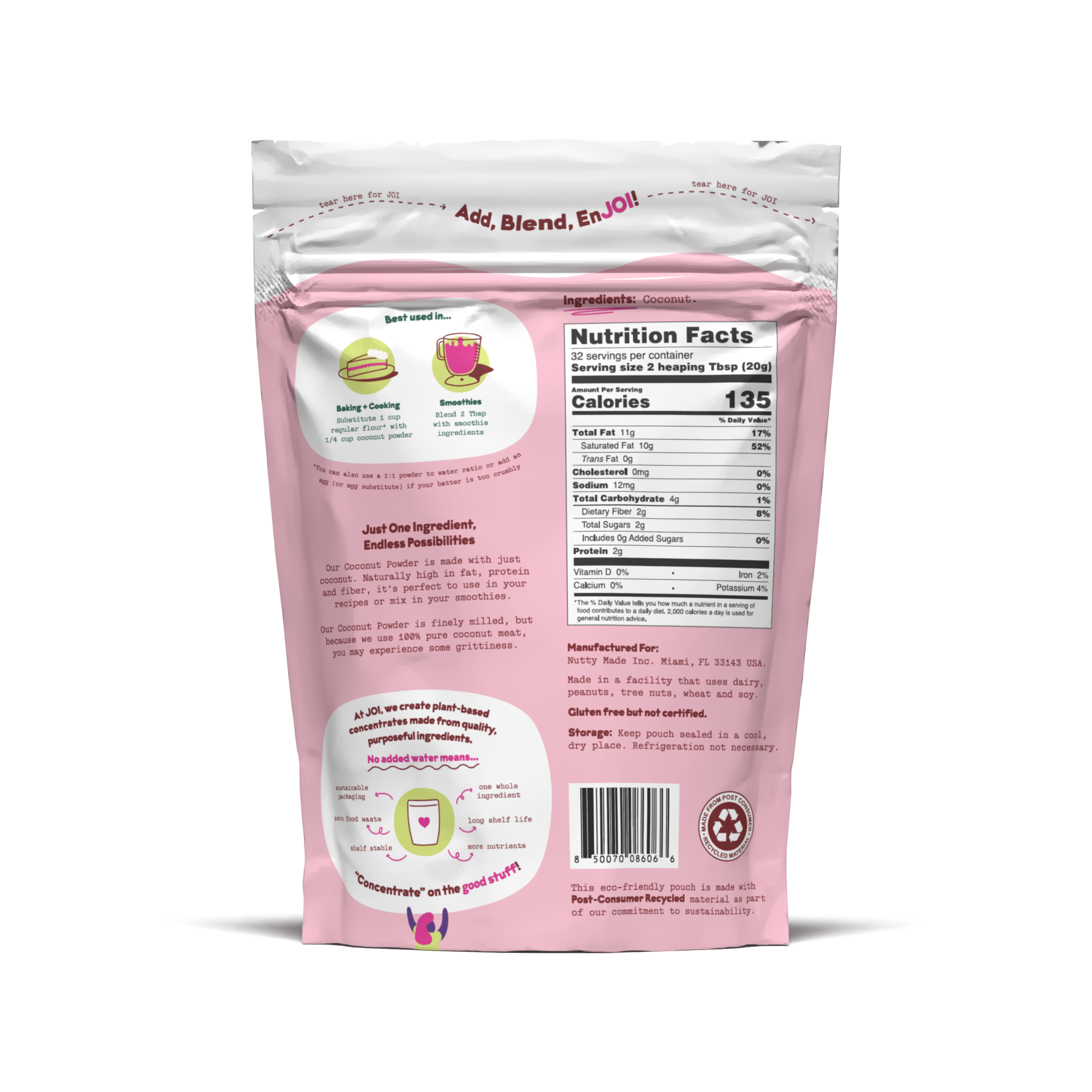 Note: Our coconut powder is made from 100% pure coconut—nothing else. We intentionally keep all the natural components of the coconut, including what’s typically separated out during coconut milk production, to deliver its full-fat richness, fiber, and flavor. Because we don’t use carriers or emulsifiers, you may notice slight clumping or that it doesn’t dissolve as easily as conventional powders. That’s the result of keeping it real—more fiber, more coconut, and nothing artificial.
