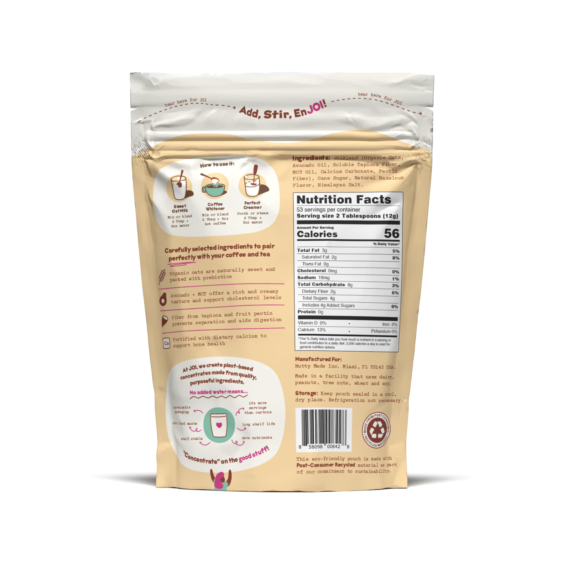 JOIBlend™ (Organic Oats, Avocado Oil, Soluble Tapioca Fiber, MCT Oil, Calcium Carbonate, Pectin Fiber), Cane Sugar, Natural Hazelnut Flavor, Himalayan Salt.